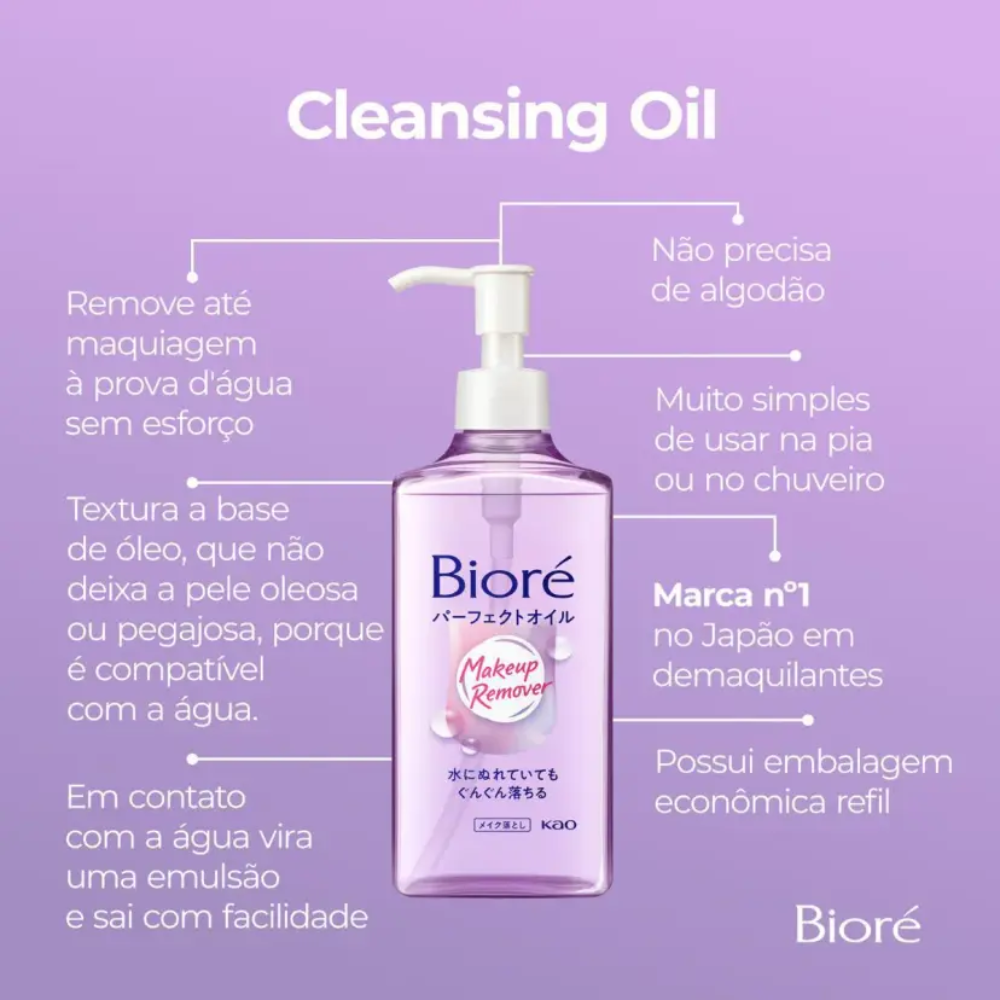 O Bioré Cleansing Oil é um óleo demaquilante facial de alta eficácia, que remove até as maquiagens mais resistentes, incluindo rímel à prova d’água, sem esforço e sem deixar resíduos.