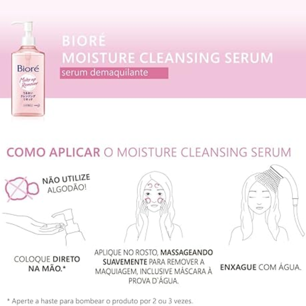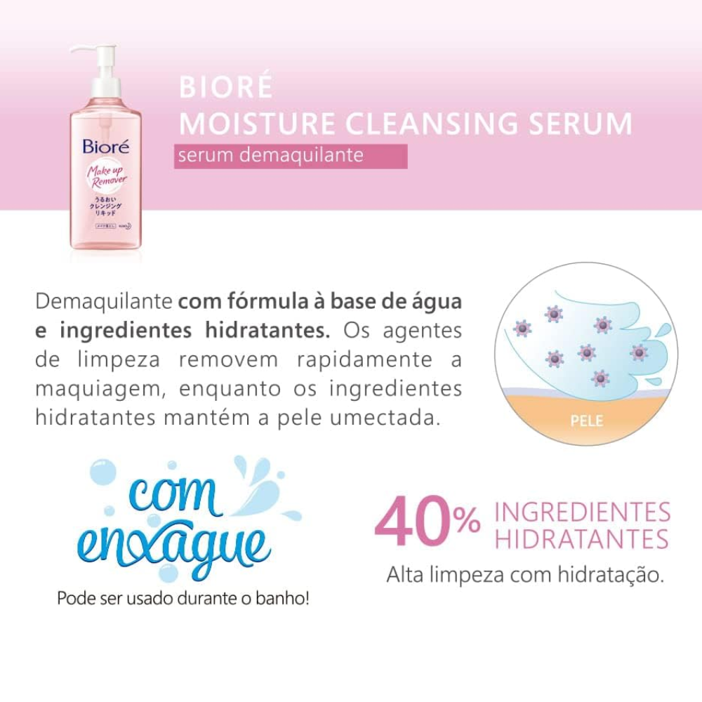 O Bioré Moisture Cleansing Serum é um sérum demaquilante leve e eficaz, desenvolvido para remover maquiagem de forma rápida e suave, enquanto hidrata a pele.