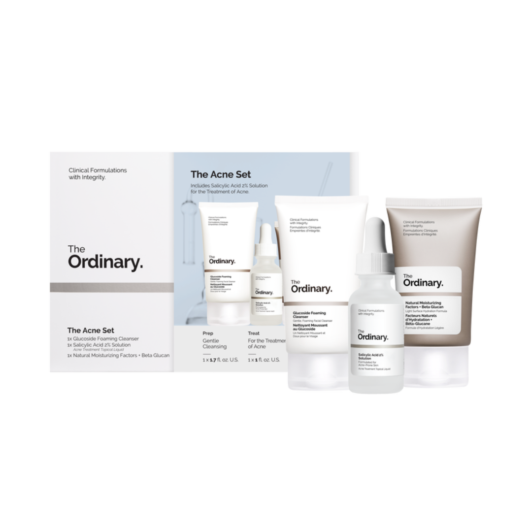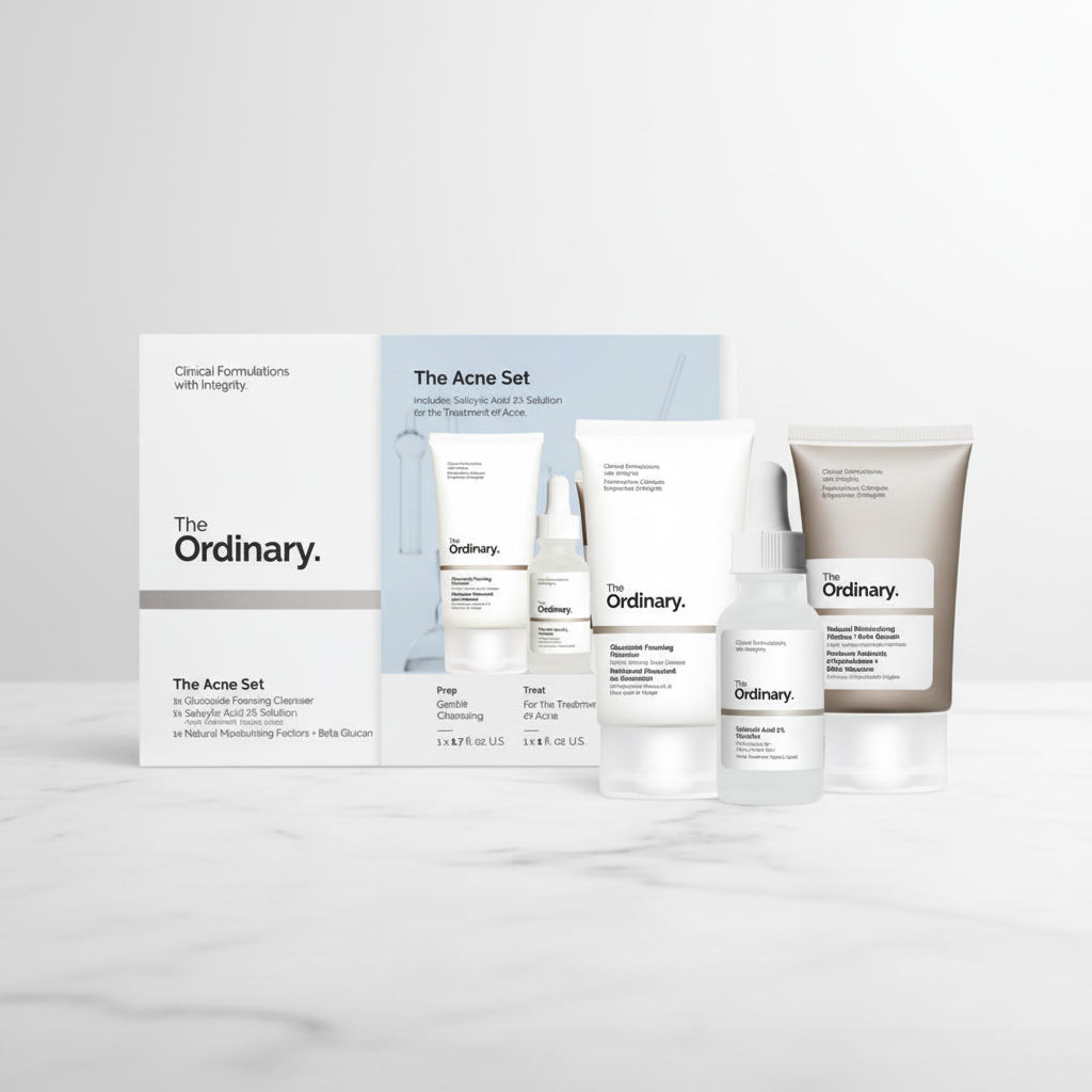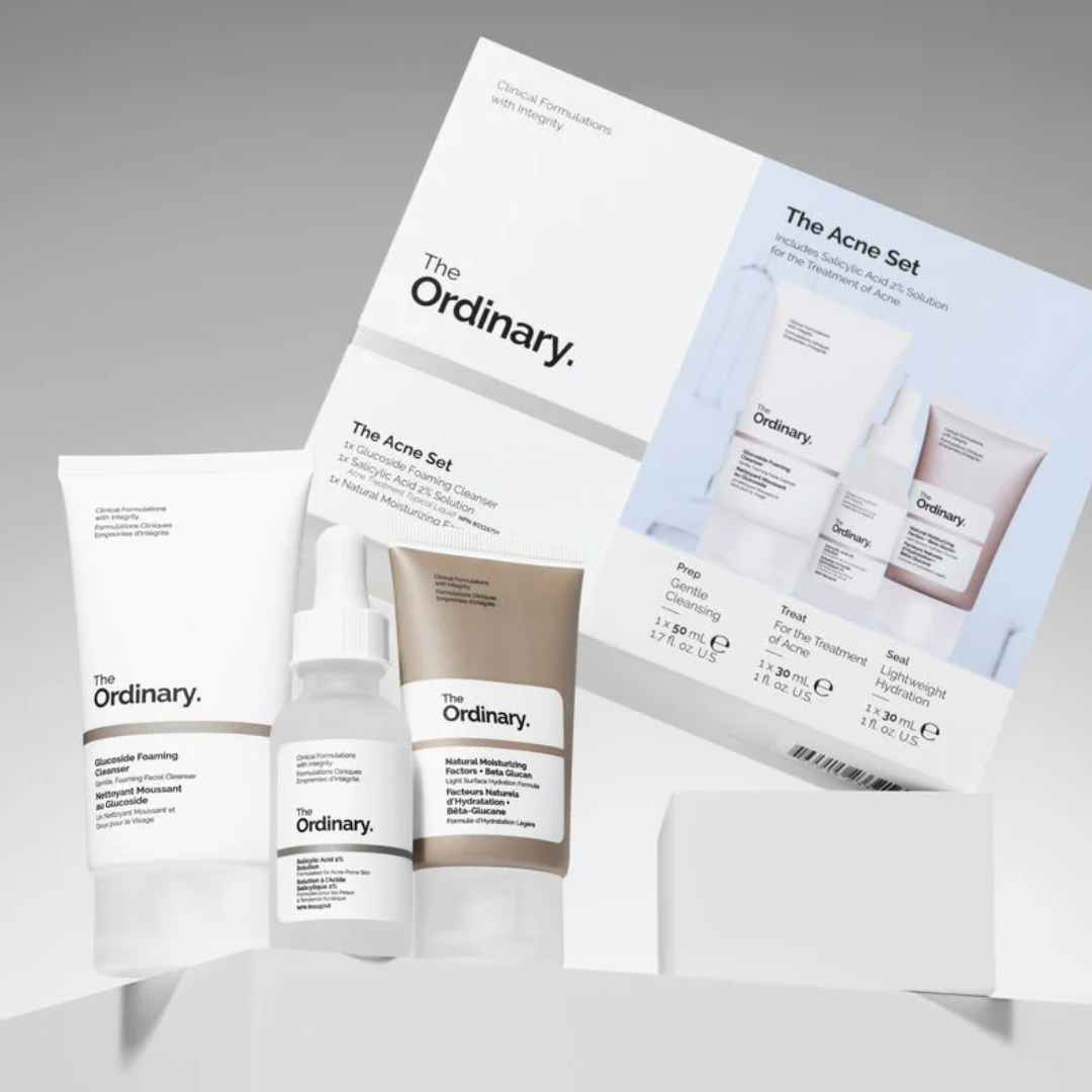 O The Acne Set da The Ordinary é um kit de cuidados com a pele desenvolvido para ajudar a limpar, tratar e hidratar a pele com tendência à acne.